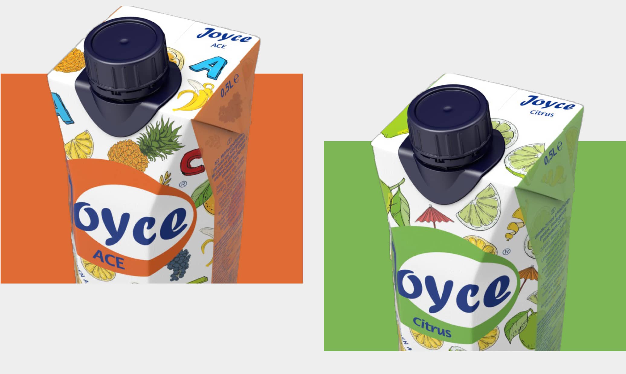 Seit vielen Jahren bestimmen fotorealistische Früchte Abbildungen das Verpackungsdesign der Joyce Fruchtsaft Verpackungen. Das ovale Joyce Logo verbindet alle Sorten miteinander und sorgt für die Wiedererkennbarkeit der Produkte.